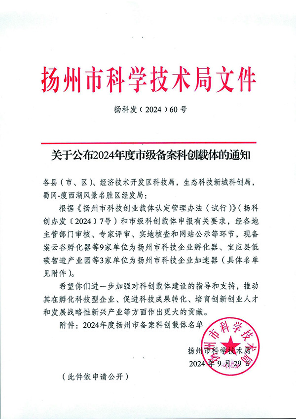 扬科发〔2024〕60号-关于公布2024年度市级备案科创载体的通知